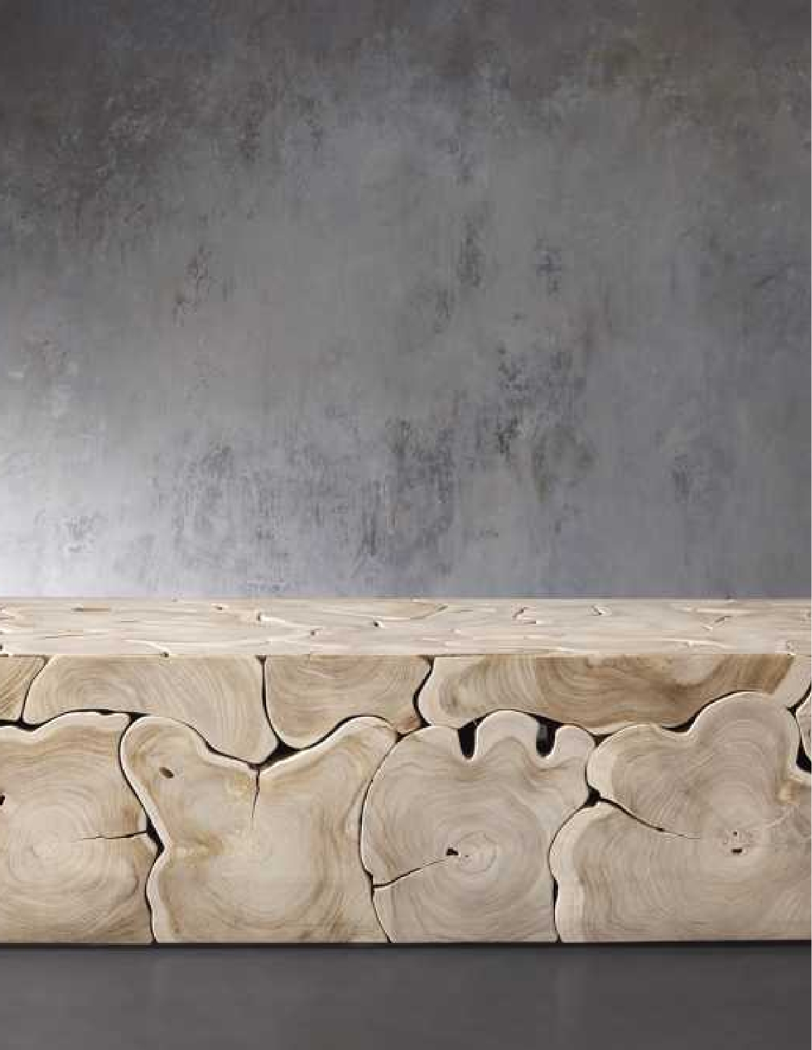 $2,499.00Celebrating the organic beauty of natural teak wood, our Kalmar Occasional Collection is masterfully handcrafted by Indonesian artisans from slices of teak heartwood and sapwood affixed to solid wood frames for added strength and stability. Each hand-cut section of teak is carefully sanded, smoothed, waxed, and sealed by hand to enhance its natural variations in wood tones, grain patterns, texture, and shape. Rustic surfaces feature bold organic shapes, cracks, and other features inherent to the natural wood that continue to develop over time, adding distinct character to each piece without affecting its quality or performance.
