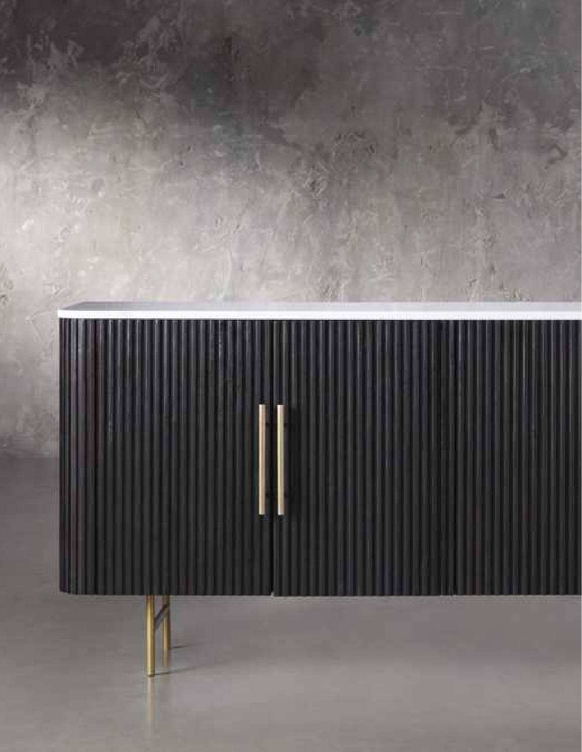 An alternation of rounded shapes and geometrical lines, reassuming discipline and freedom, a composite, multiethnic plan in which each component and each material contributes to the harmonious balance of the piece. Il Pezzo 1 Black Credenza is completely made of black stained solid ash with thin metal inlays encased in the structure. The top is a beautiful slab of black Marquinia marble and the base, made of brass casting, is available in different finishes. The wood is treated with natural oil that protects the wood but at the same time allows it breathe, leaving the extraordinary feel of this beautiful, natural material unchanged to the touch. A small brass cylinder inserted in every piece, containing serial number, seals the authenticity and uniqueness. Available in custom sizes and finishes.