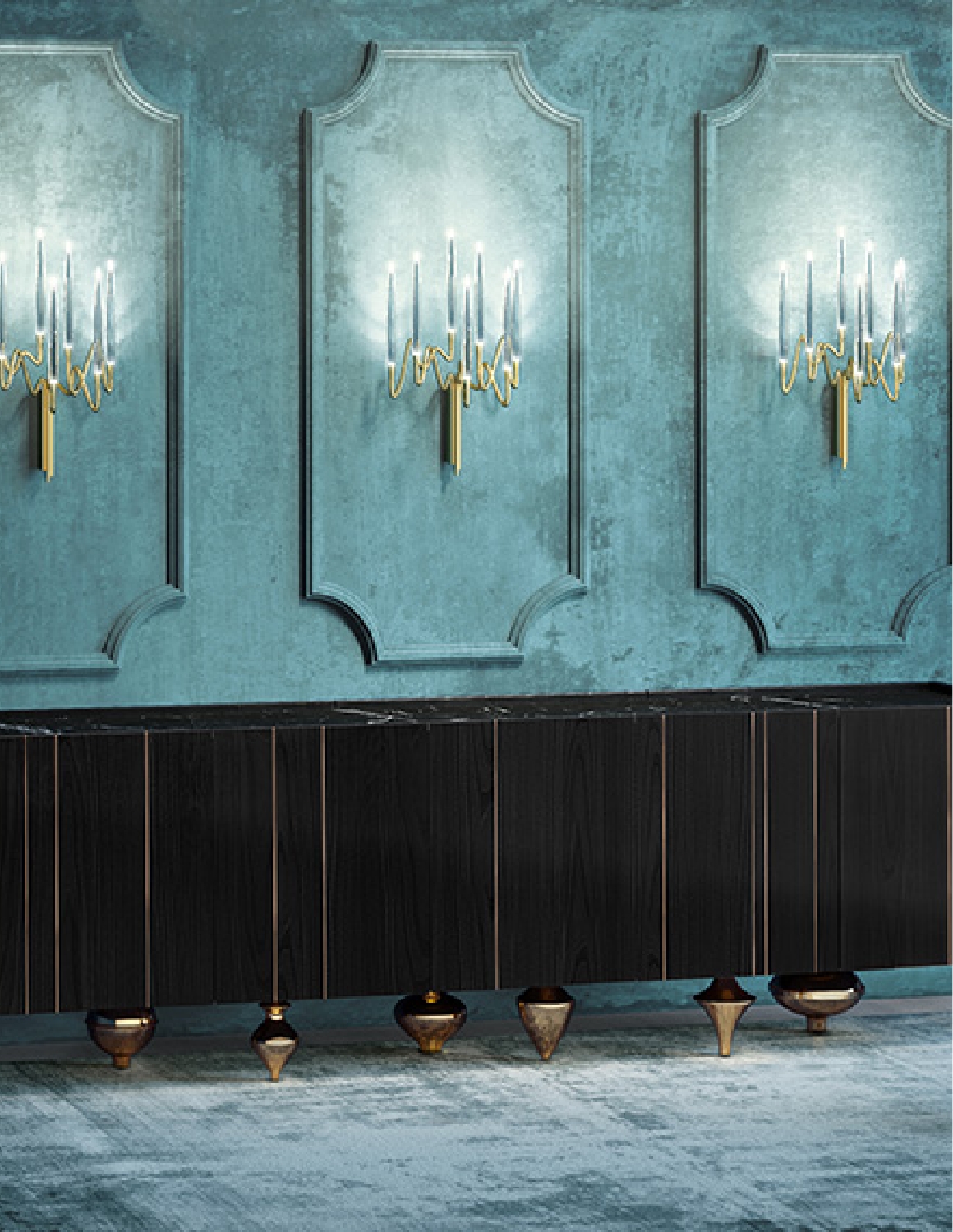 Rigid, strong and impenetrable, like a medieval Florentine palace it seems to be suspended and floating over an imaginary Arno river. Il Pezzo 10 shows off its embossed wood giving it a medieval taste. The wood shows infinite shades and colors, it invites us to stroke these rounded surfaces, finely smoothened and ripe with the smell of essential oils, giving a real celebration of senses. Encased in the structure, delicate drapes for the cast brass handles and, to hold all of this up, a multitude of brass casting sparkling legs. The whole piece is realized with solid walnut, the treatment on the wood is done with natural oil that protects the wood but at the same time allows it breathe, leaving the extraordinary feel of this beautiful, natural material unchanged to the touch. Furthermore the final coat on the top is done with Nanotechnology, an organic silica-based natural treatment which makes the wood water repellent. A small brass cylinder inserted in every piece, containing serial number, seals the authenticity and uniqueness. Available in custom sizes and finishes.