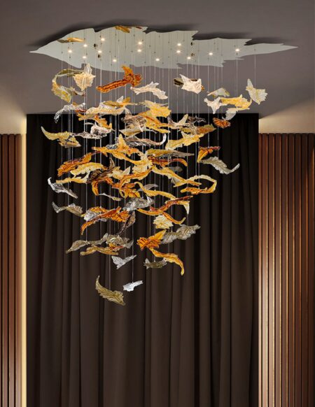 We have proposed this composition of suspended leaves in autumnal colours in shades of yellow, gold, amber and caramel that fall and are mirrored in a large ceiling rose in gilded leaf-shaped stainless steel, which also houses the integrated LED lights.The system is designed to be installed directly in residential environments and can be replicated on a larger scale even without a metal ceiling frame.
