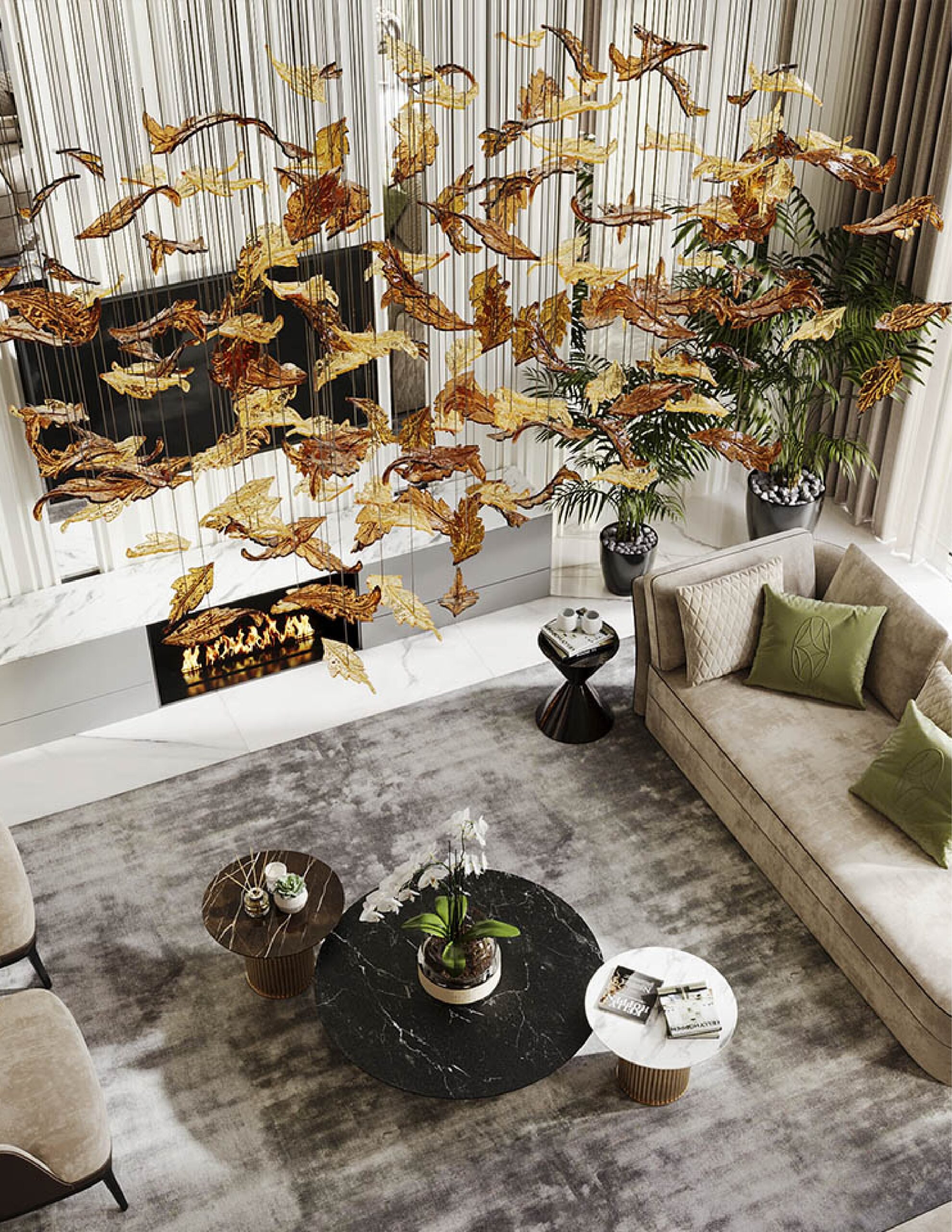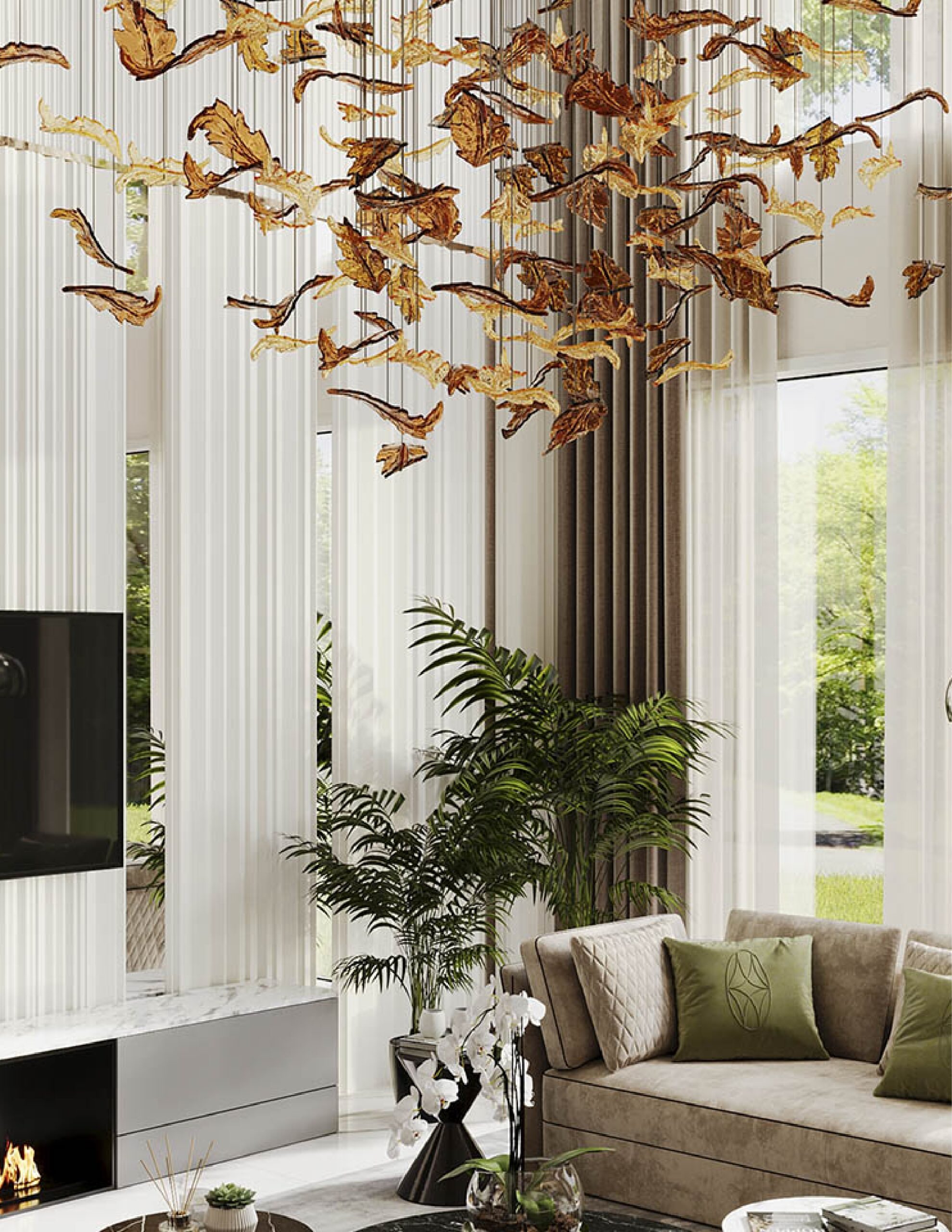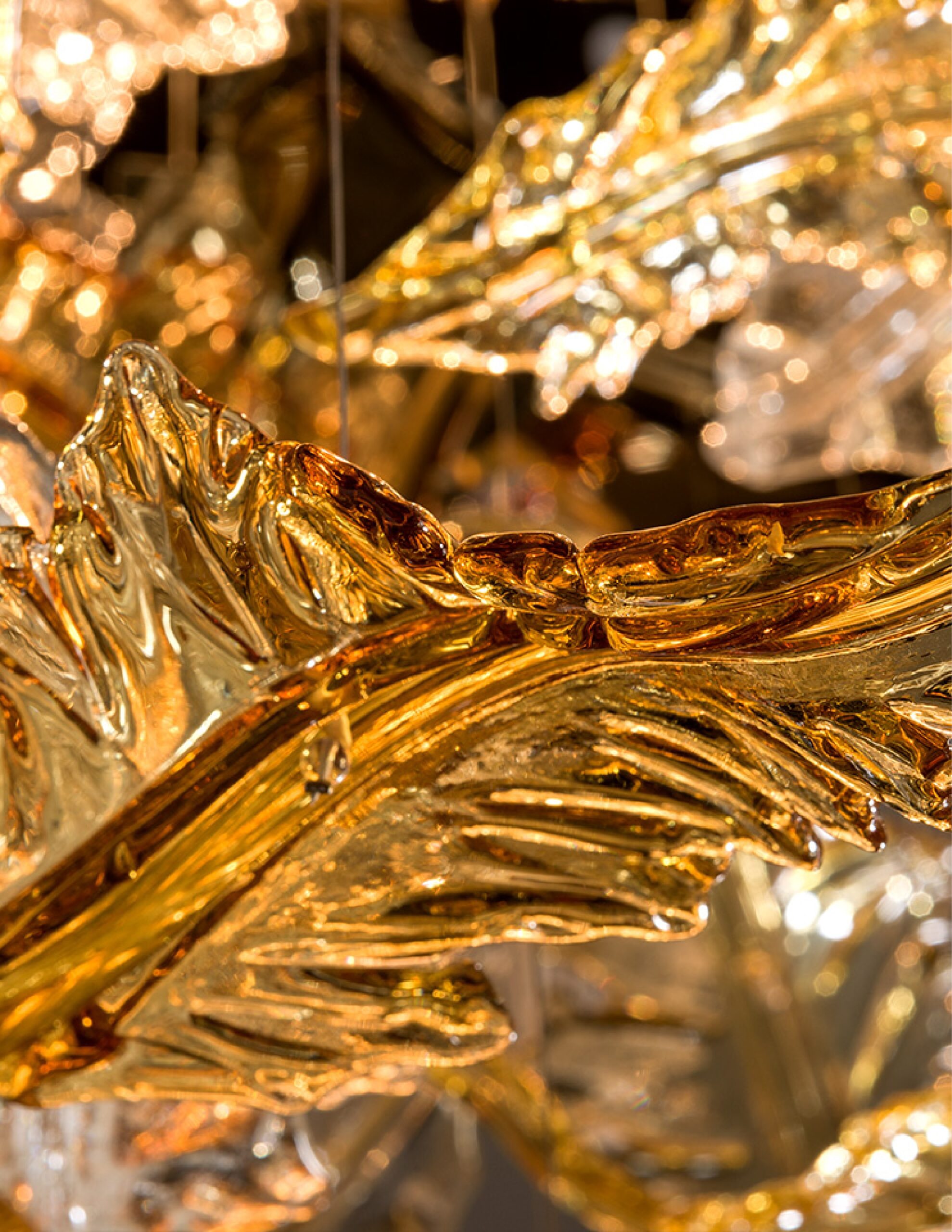 We have proposed this composition of suspended leaves in autumnal colours in shades of yellow, gold, amber and caramel that fall and are mirrored in a large ceiling rose in gilded leaf-shaped stainless steel, which also houses the integrated LED lights.