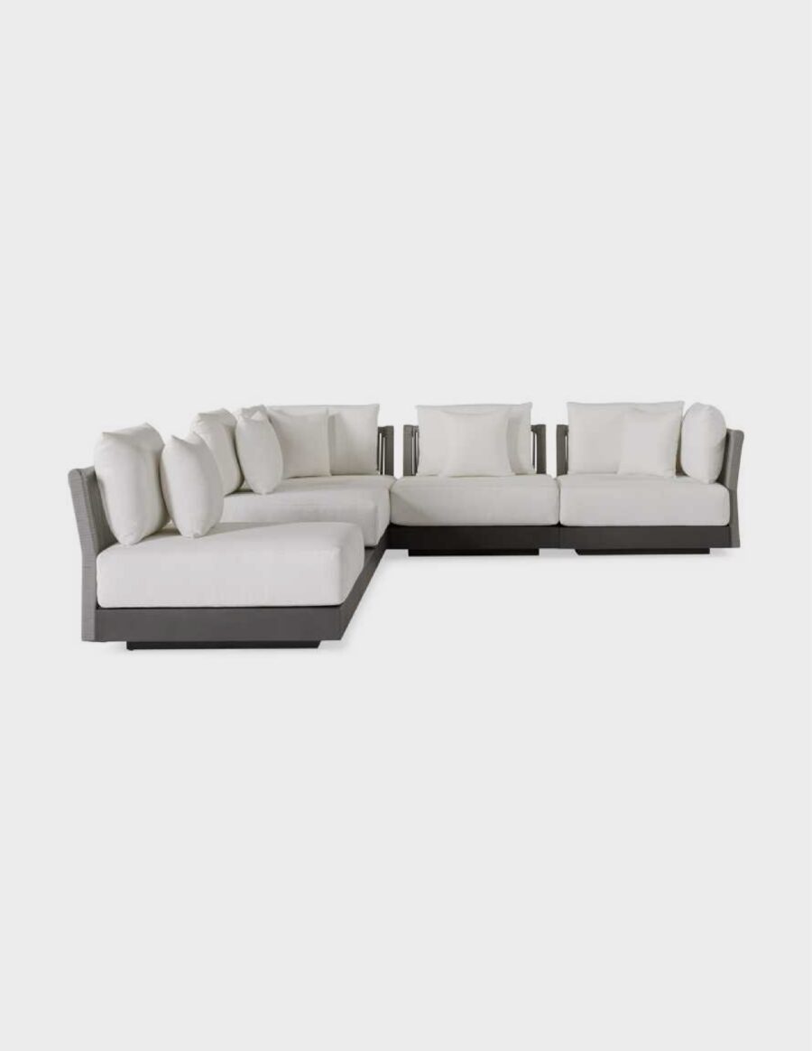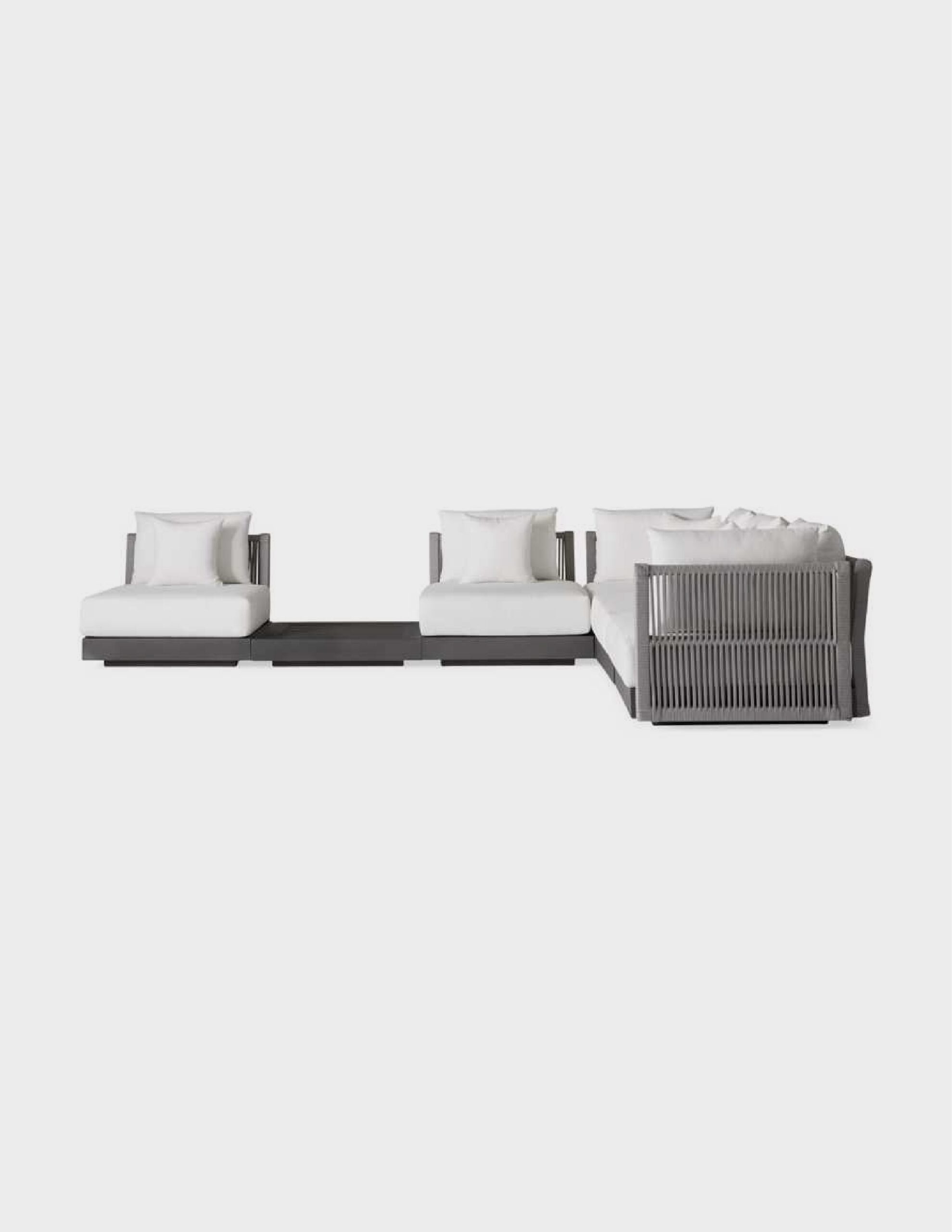 A study in modularity and mixed-material styling, our Naxos Collection is where elevated outdoor spaces begin. Inspired by contemporary European designs, Naxos’ five configurable pieces are artisan-crafted from Lava Grey aluminum, while unique rope detailing lets hints of light shine through. Textured InsideOut Performance Fabric® cushions offer all-weather comfort, while the option to integrate a coffee or end table into your sectional arrangement offers endless versatility.